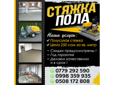 СТЯЖКА ПОЛА Наши услуги: * Полусухая стяжка * Цена 250 сом за кв. метр Скидки предусмотрены ! Год гарантия ! Делаем качественно и в срок !