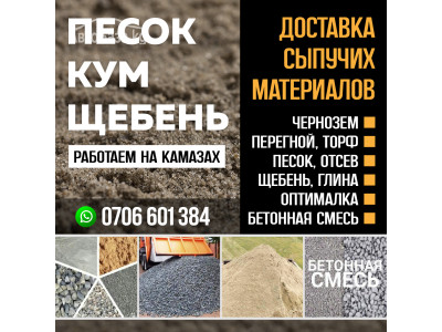 ПЕСОК КУМ ЩЕБЕНЬ Доставка сыпучих материалов: * Чернозем * Перегной, торф * Песок, отсев * Щебень, глина * Оптималка * Бетонная смесь Работаем на Камазах