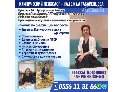 КЛИНИЧЕСКИЙ ПСИХОЛОГ - НАДЕЖДА ТАБАРЕНЦЕВА Практик ТА - Транзактный Анализ; Практик Психодрамы, АРТ - терапевт, НЛП - мастер Работаю очно и онлайн Провожу индивидуальные и семейные консультации Работаю по следующим вопр...