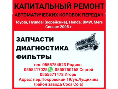 Капитальный ремонт автоматических коробок передач. Toyota, Hyundai (корейские), Honda, BMW, Mers. Свыше 2005 г. Запчасти. Диагностика. Фильтры на все авто. тел: 0555754523 Родион, 0555417025 WhatsApp, 0555750168 Сергей, 0555571478 Иго...