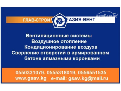 ОсОО "Глав-Строй-Азия-Вент" Вентиляционные системы Воздушное отопление Кондиционирование воздуха Сверление отверстий в армированном бетоне алмазными коронками и другие жестяные работы. Компания ОсОО «Гла...
