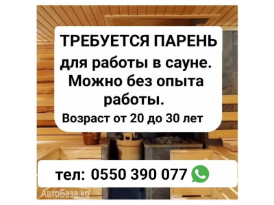 Требуется парень для работы в сауне. Можно без опыта работы. Возраст от 20 до 30 лет Подробности по телефону. Тел/WhatsApp: 0550 390 077
