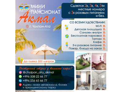 Мини пансионат Акмал. Сдаются 2х, 3х, 4х, 5ти местные номера с 3х разовым питанием и без , с.Чолпон-Ата . Со всеми удобствами: -wi-fi -детская площадка -санузел внутри - бесплатная парковка -тапчан -кафе -3-х разовое питание -пов...