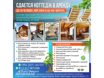 Сдается коттедж в аренду, до 10 человек, вип зона в ЦО «Ак-Марал», со всеми удобствами (три туалета, посуда на все персоны, высокоскоростной интернет, летняя кухня, летняя терасса, вип пляж) Расстояние до пляжа:50 м (первая...