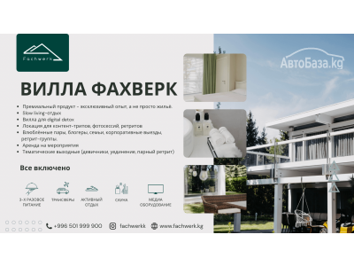 Информация о Вилле 1. Название виллы: Фахверк 2. Контакты: Телефон: +996 501 999 900 Сайт: www.fachwerk.kg Электронная почта: info@fachwerk.kg WhatsApp: +996 501 999 900 Telegram: +996 501 999 900 Instagram: fachwerkk 3. Адрес/Рас...