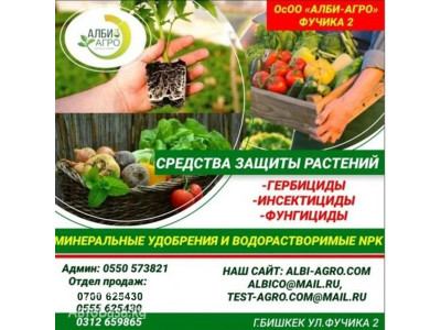 ОсОО «АЛБИ-АГРО», Фучика 2 Средства защиты растений: Гербициды Инсектициды Фунгициды Минеральные удобрения и водорастворимые NPK Товары продаются по ценам ниже рыночных! Индивидуальный подход к каждому клиенту. Ц...