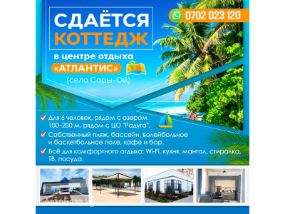Ищете идеальное место для отдыха? Сдаётся уютный коттедж в центре отдыха «Атлантис» (с. Сары-Ой)! Для компании до 6 человек. Что вас ждёт: — Собственный пляж (100–200 м до озера) — Бассейн, волейбол, бас...