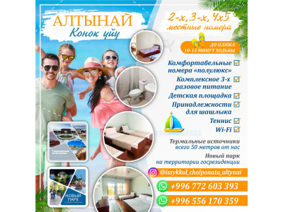 Гостевой дом «Алтынай» в Чолпон-Ате! 2-х, 3-х, 4-х и 5-ти местные номера До пляжа 10-15 мин. ходьбы Комфортабельные номера полулюкс Комплексное 3-х разовое питание Детская площадка Принадлежности для шашлыка Теннис Wi-...